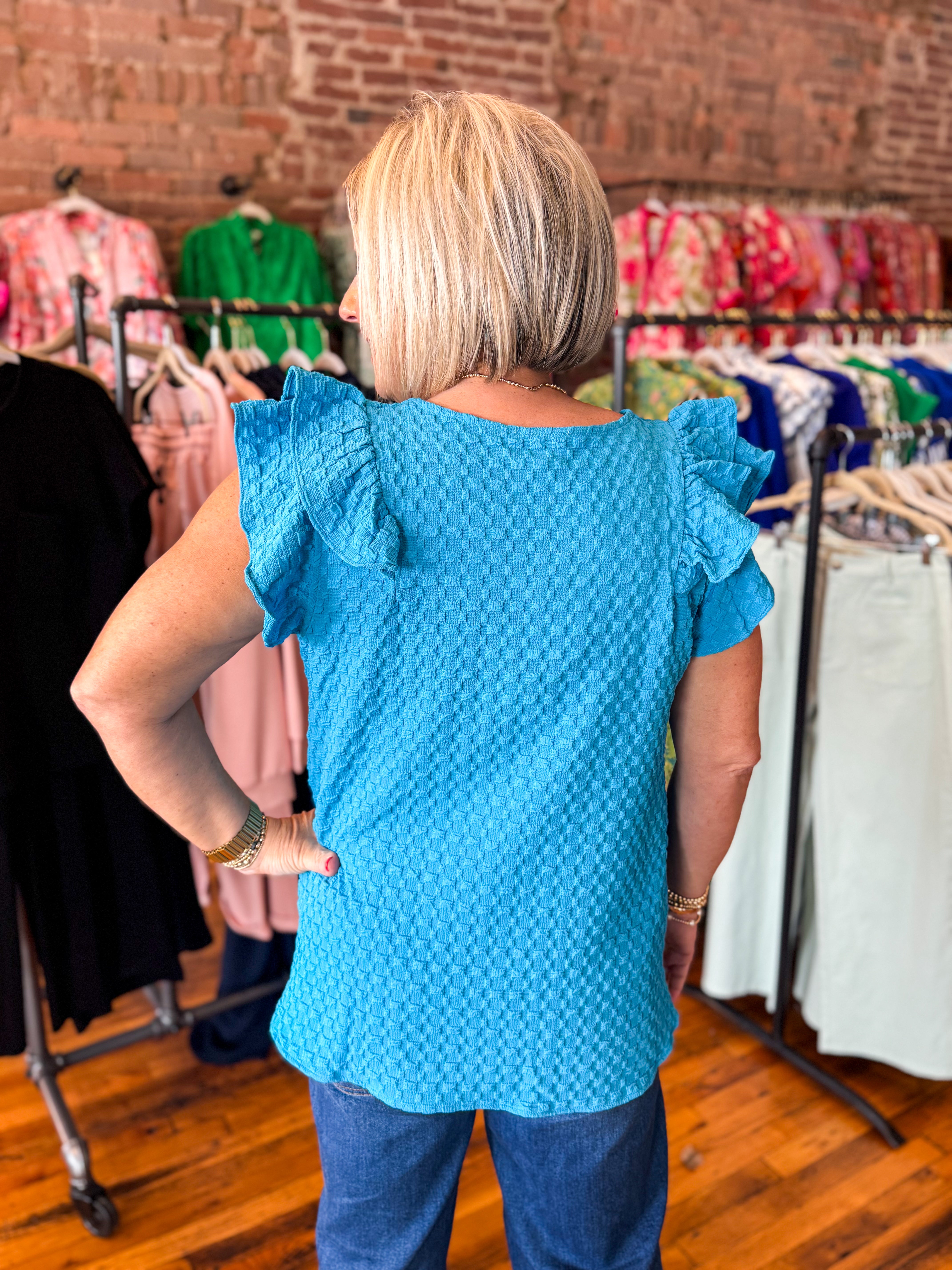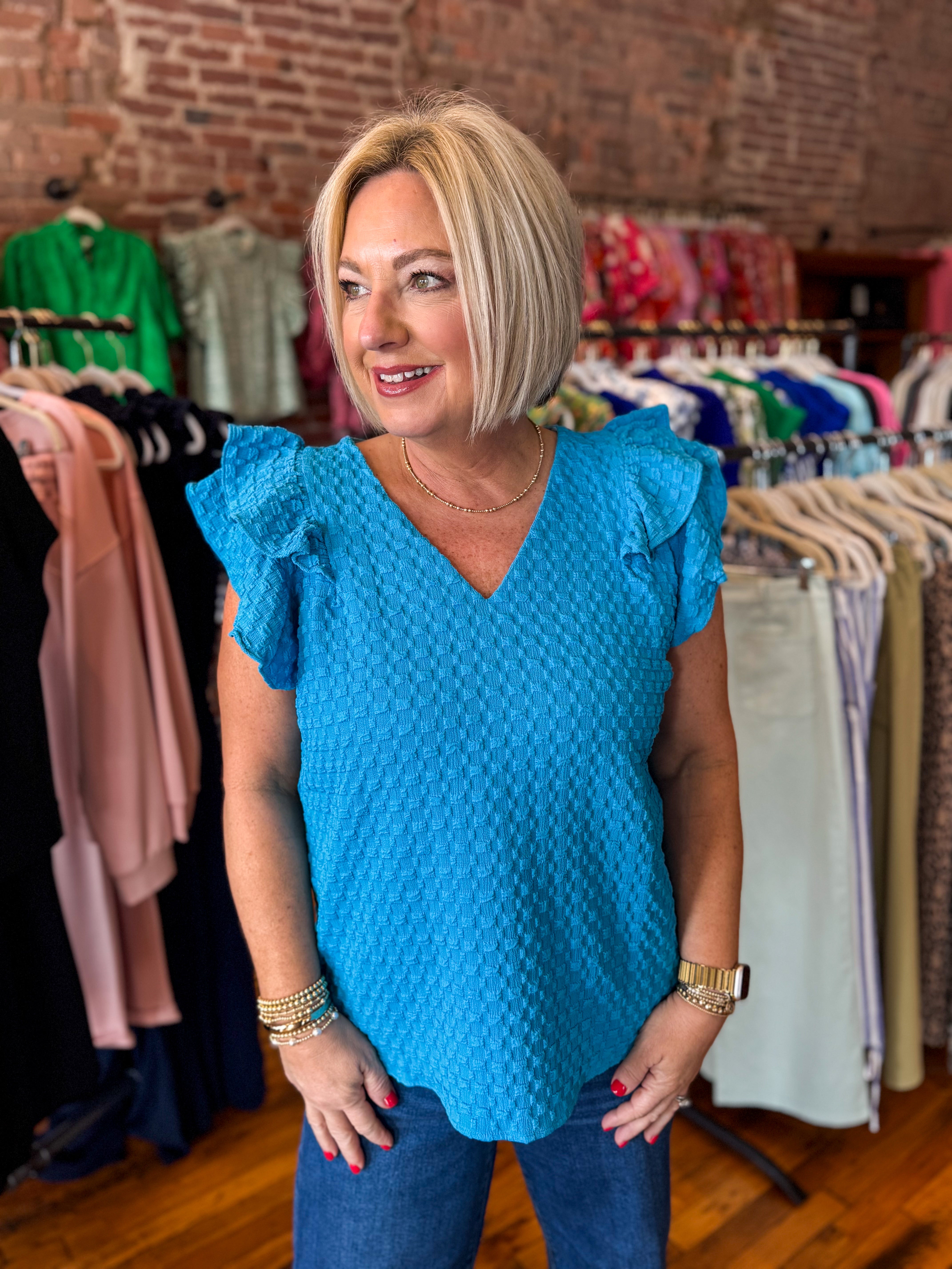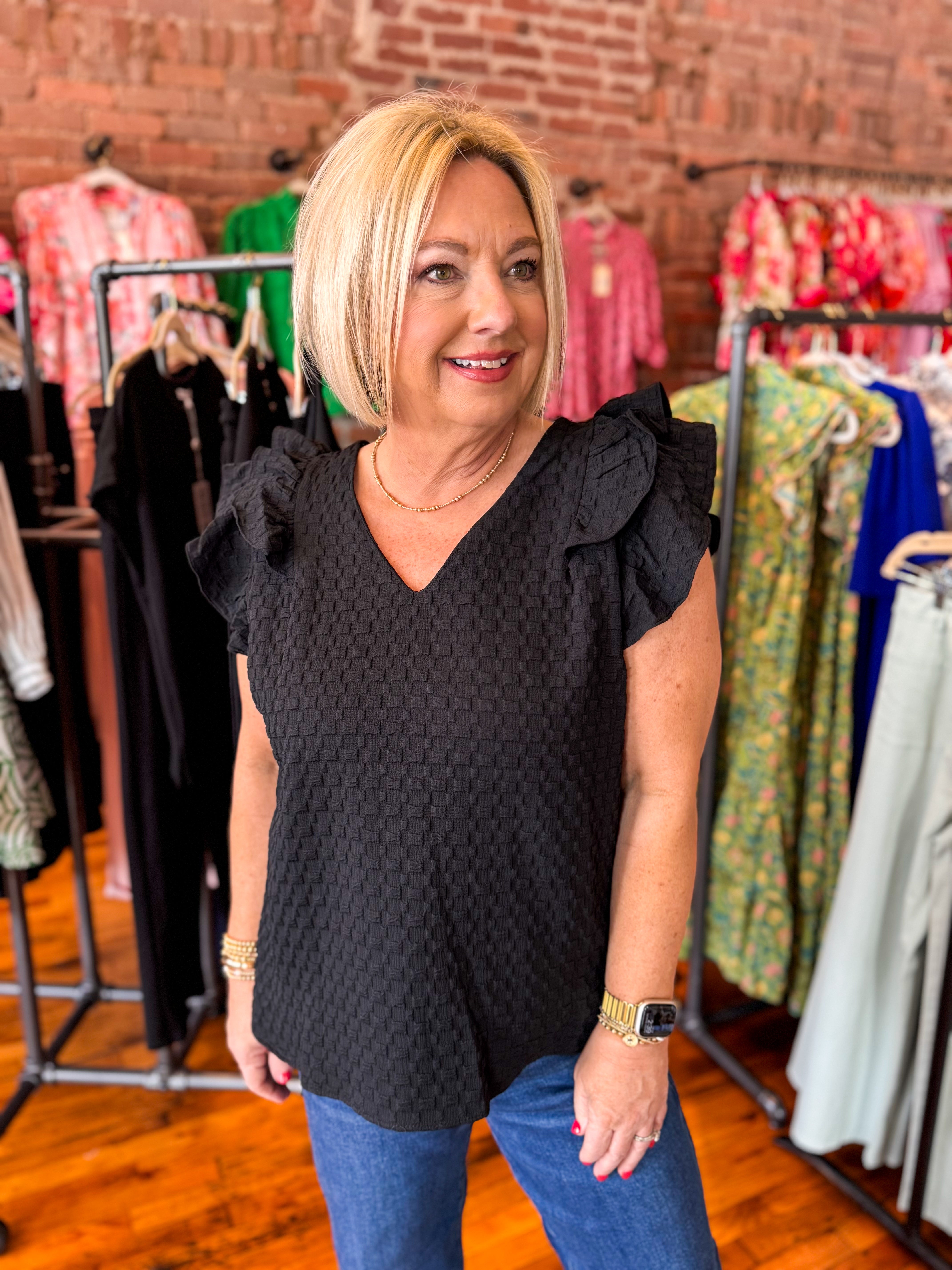 Fall in love with our Feeling Romantic Top! Made with textured jacquard fabric, this top will add elegance and texture to your wardrobe. The ruffle sleeves and v-neck add a touch of femininity. Perfect for date nights or special occasions.