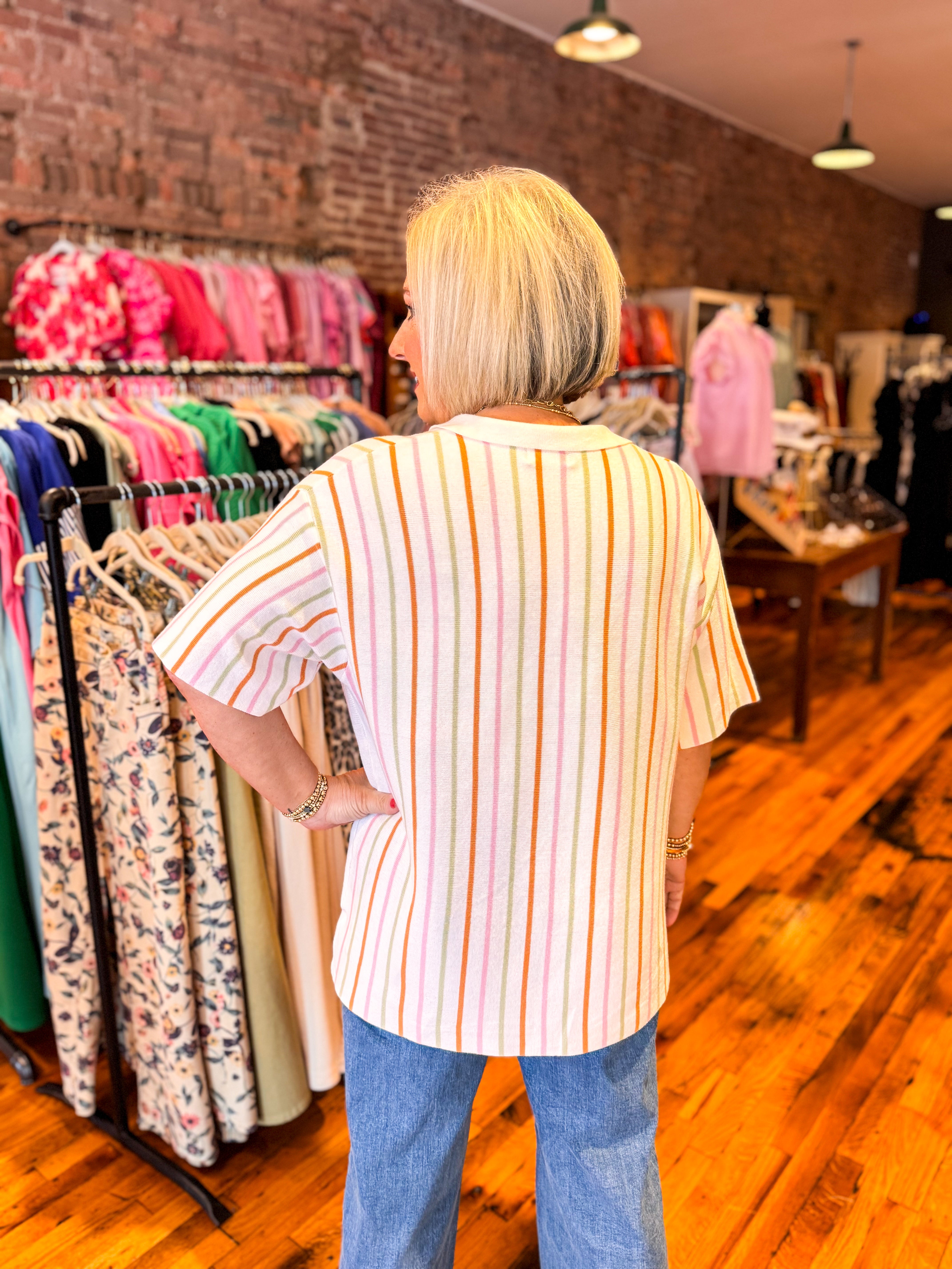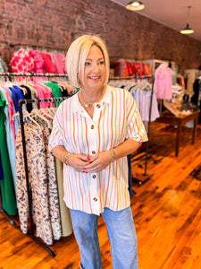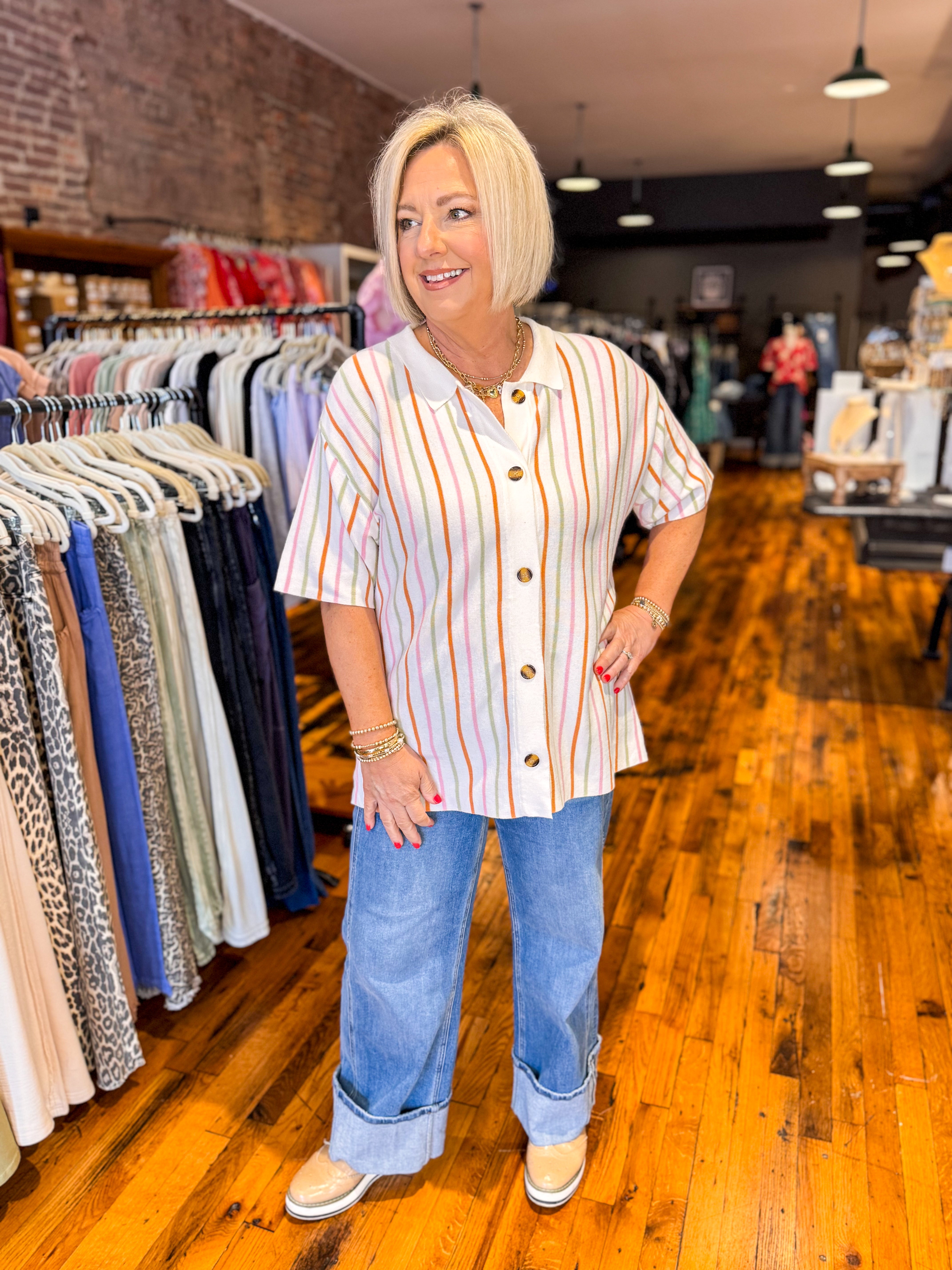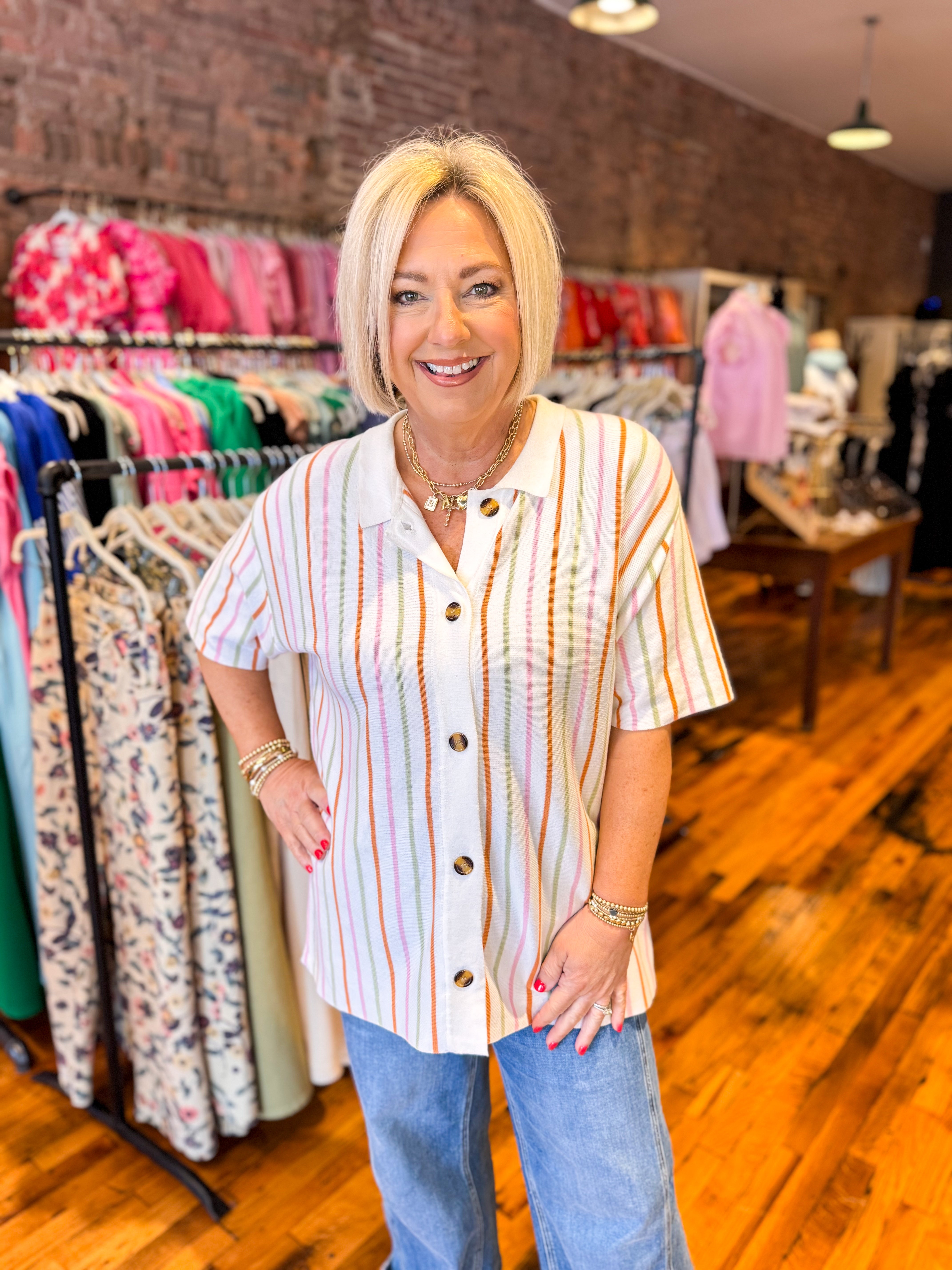 Wrap yourself in luxury with our Golden Glow Sweater Top. This versatile piece features a flattering striped design, convenient button front, and a stylish collar. Wear it as a shirt or a jacket and experience the super soft material. Elevate your wardrobe with this must-have item today!