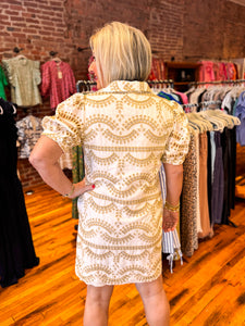 The Lovely Day Dress is a must-have for any fashion-forward individual. Featuring a stunning geometric pattern and an open collar neck, this dress will make you stand out in any crowd. Plus, the convenient side pockets and adorable puffed short sleeves with band cuffs add a touch of functional yet fashionable detail. Elevate your wardrobe with this versatile and eye-catching dress!