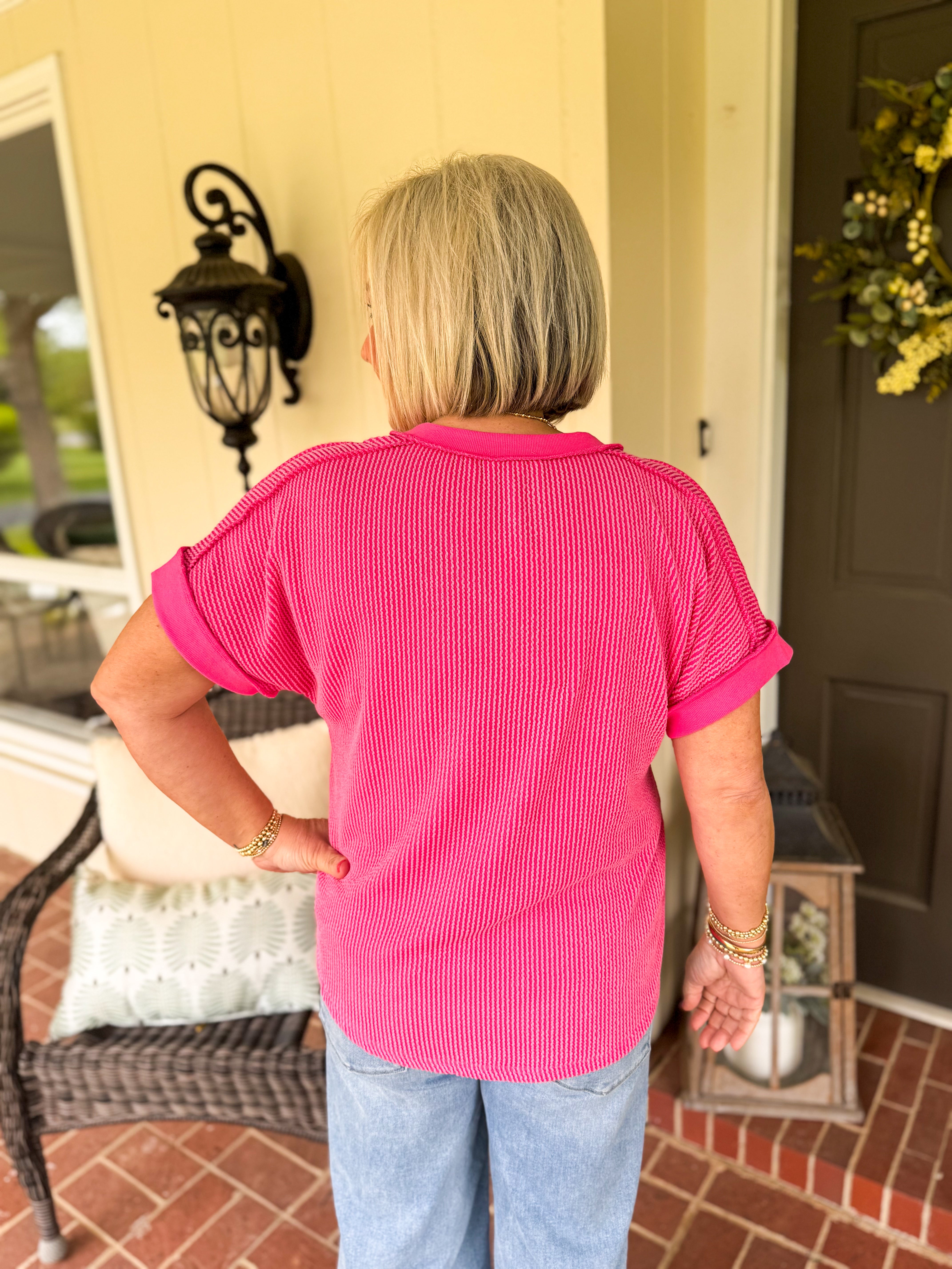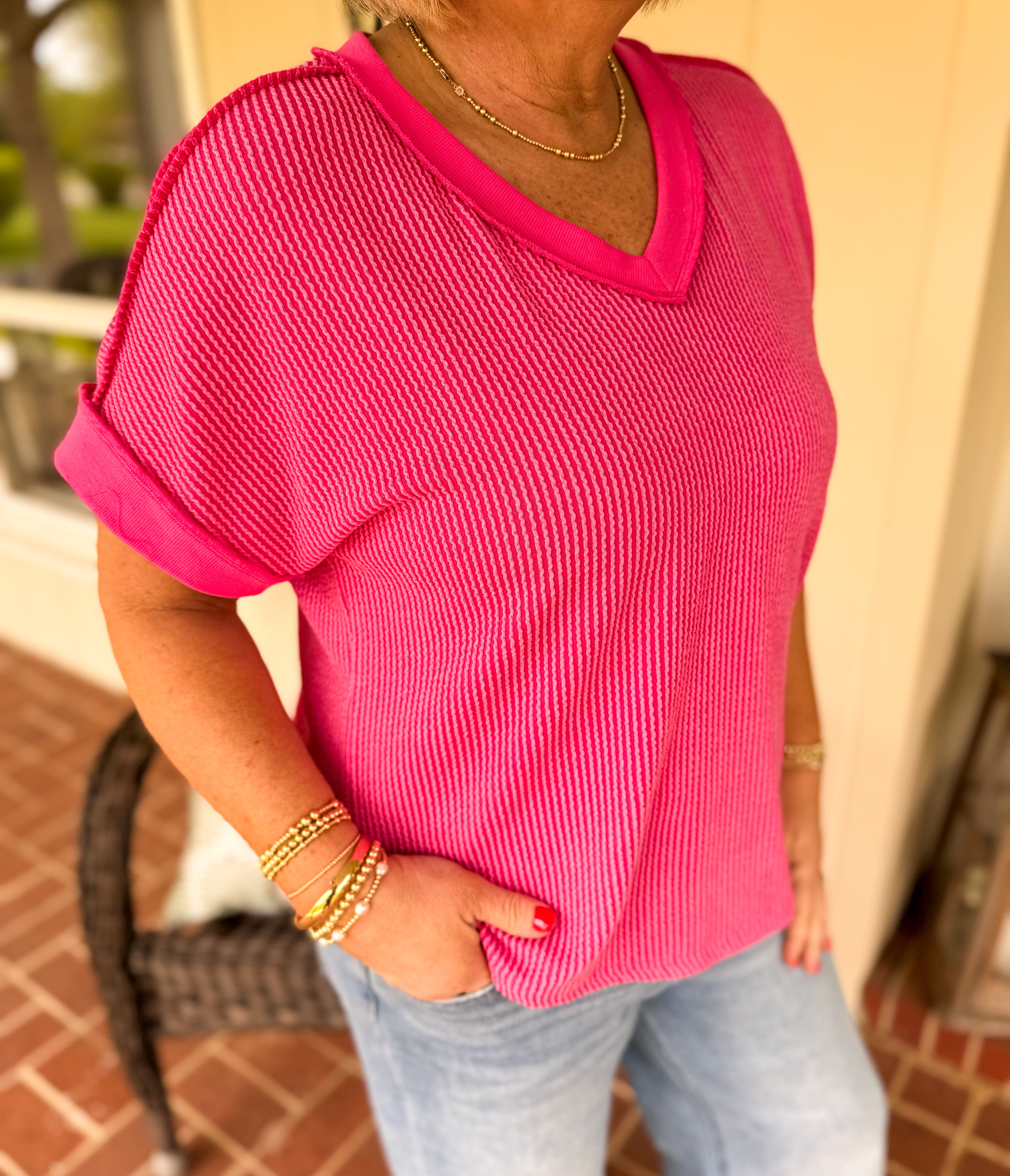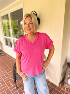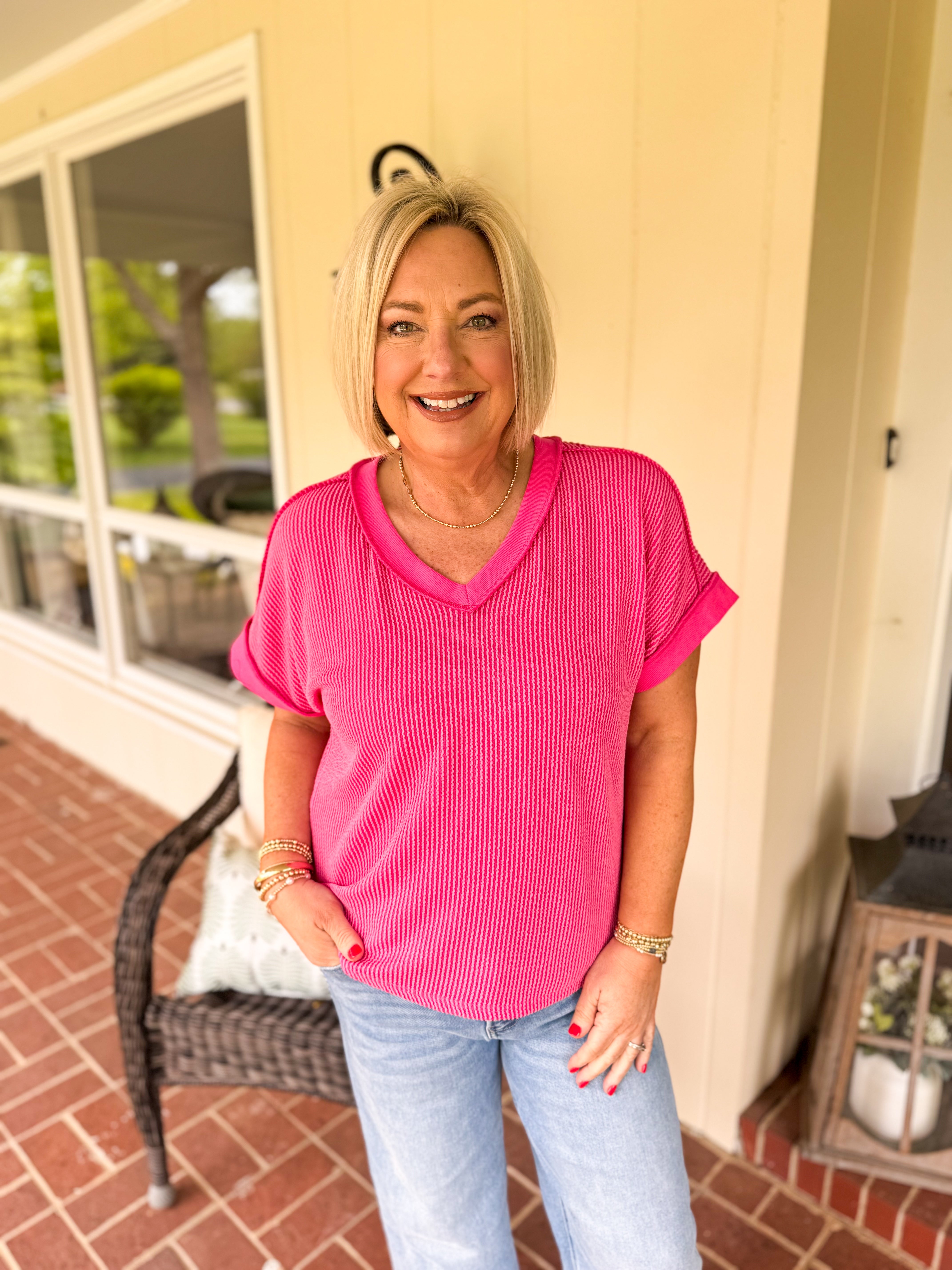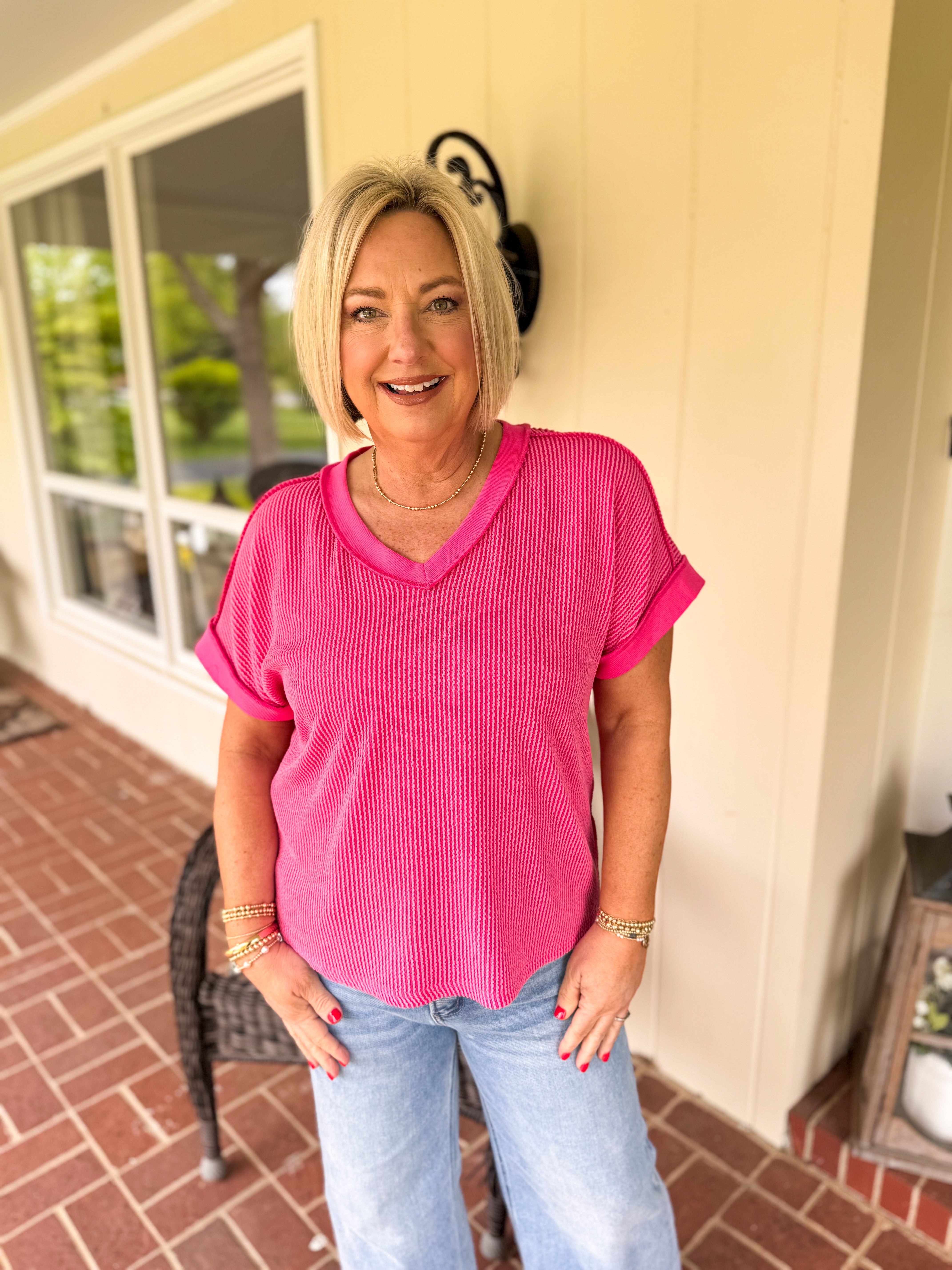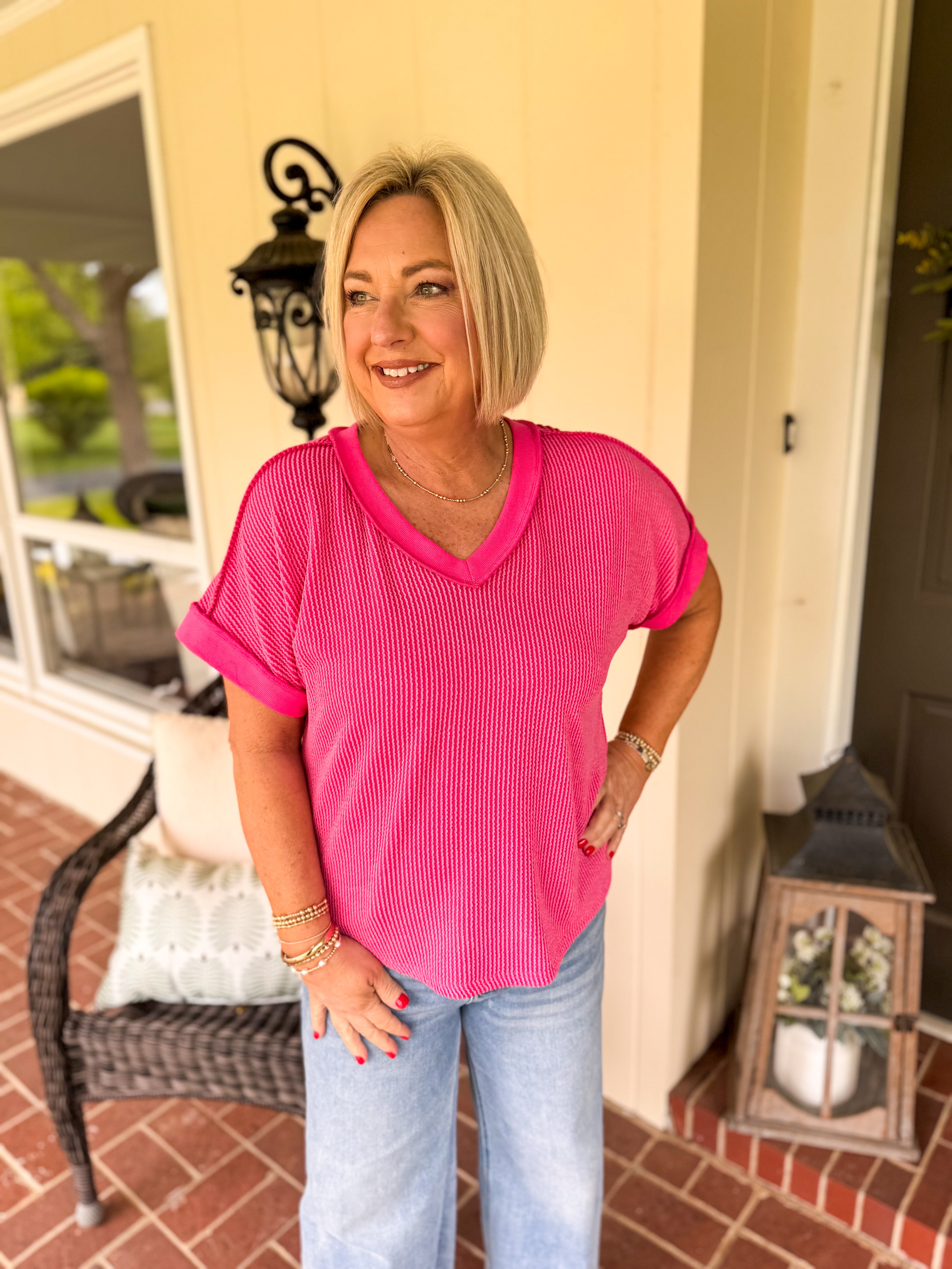 Experience the warmth and comfort of the Sunshine Feels Top! This ribbed top features a flattering V-neck, short dolman sleeves, and ribbing at the neckline and sleeve ends for a cozy and stylish fit. The stitch edge adds a touch of detail to elevate your look. Perfect for a sunny day out or lounging at home.